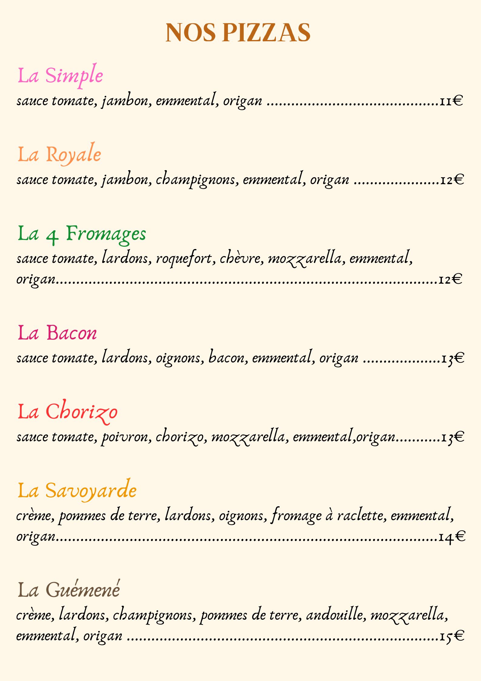 Vous trouverez la carte des pizzas proposées ci-jointe.