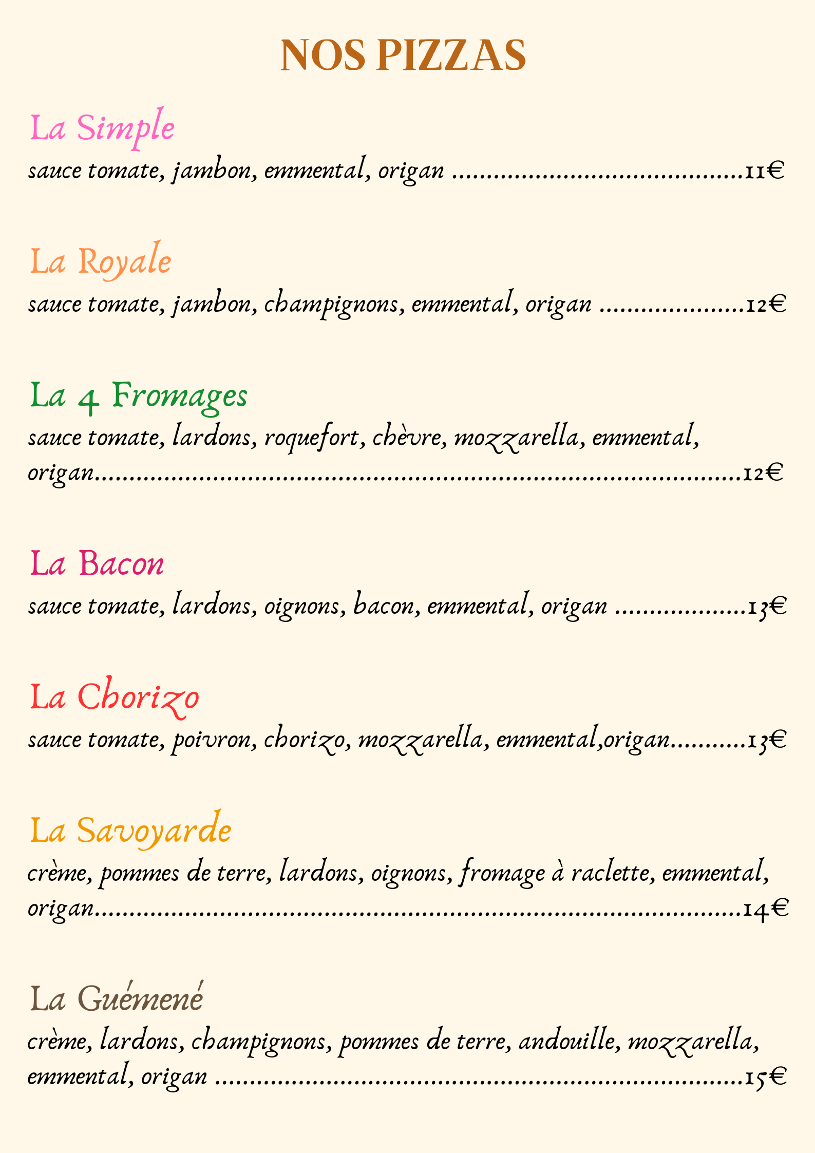 Vous trouverez la carte des pizzas proposées ci-jointe