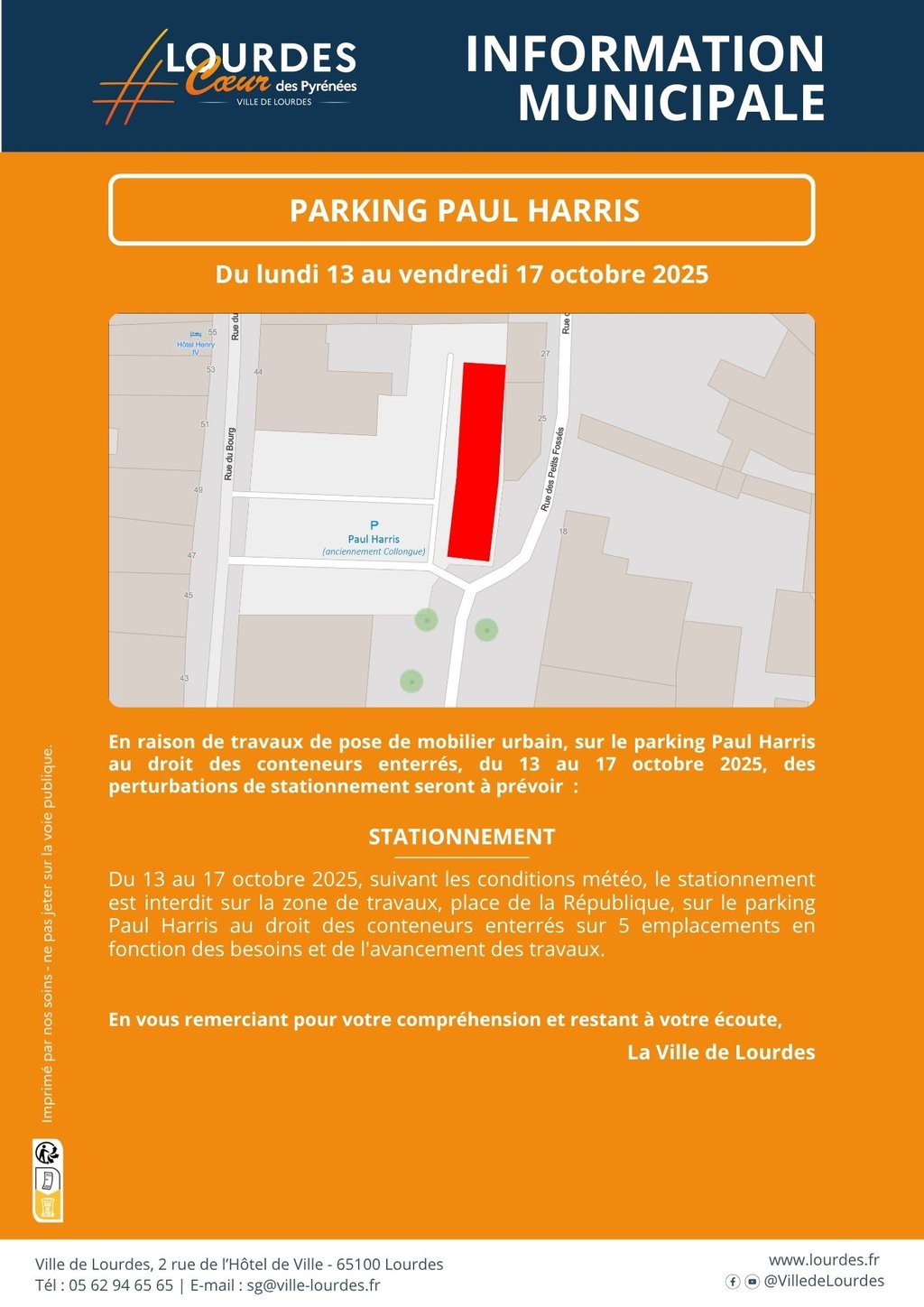 En raison de travaux de pose de mobilier urbain, sur le parking Paul Harris au droit des conteneurs enterrés, du 13 au 17 octobre 2025, et place de la République, sur le parking situé au droit de la résidence Le Lavedan, du 13 au 31 octobre 2025, des perturbations de stationnement seront à prévoir :