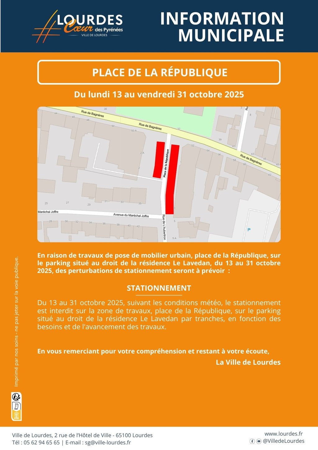 - Du 13 au 31 octobre 2025, suivant les conditions météo, le stationnement est interdit sur la zone de travaux, place de la République, sur le parking situé au droit de la résidence Le Lavedan par tranches, en fonction des besoins et de l’avancement des travaux.