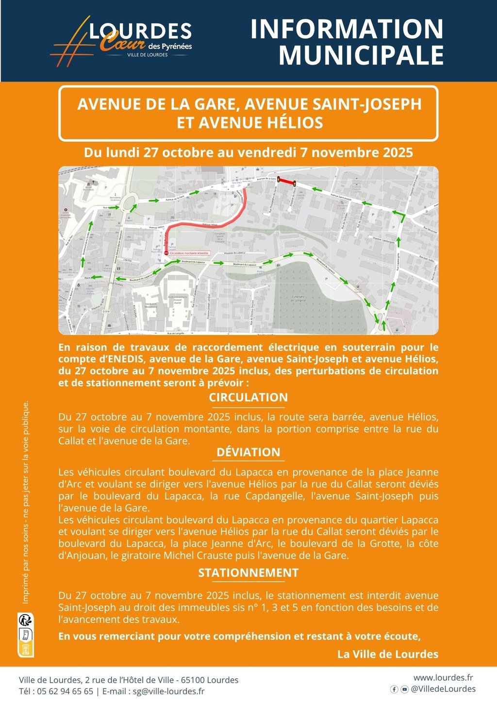 En raison de travaux de raccordement électrique en souterrain pour le compte d’Enedis, avenue de la Gare, avenue Saint-Joseph et avenue Hélios, du 27 octobre au 7 novembre 2025 inclus, des perturbations de circulation et de stationnement seront à prévoir :