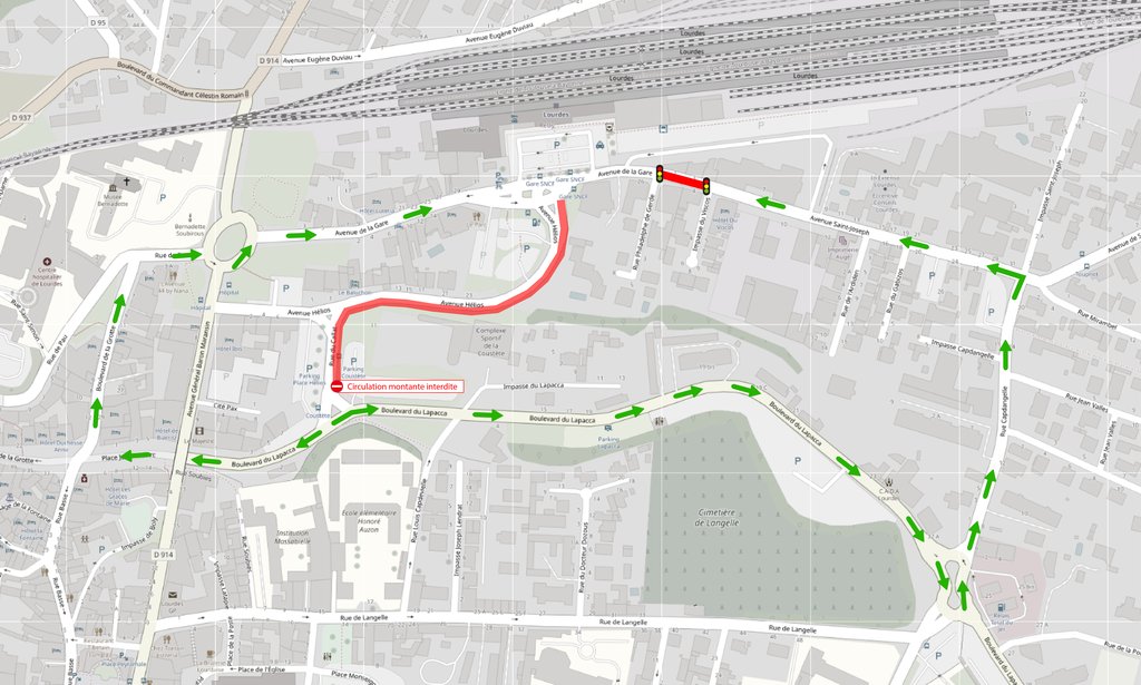 - Les véhicules circulant boulevard du Lapacca en provenance de la place Jeanne d’Arc et voulant se diriger vers l’avenue Hélios par la rue du Callat seront déviés par le boulevard du Lapacca, la rue Capdangelle, l’avenue Saint-Joseph puis l’avenue de la Gare.