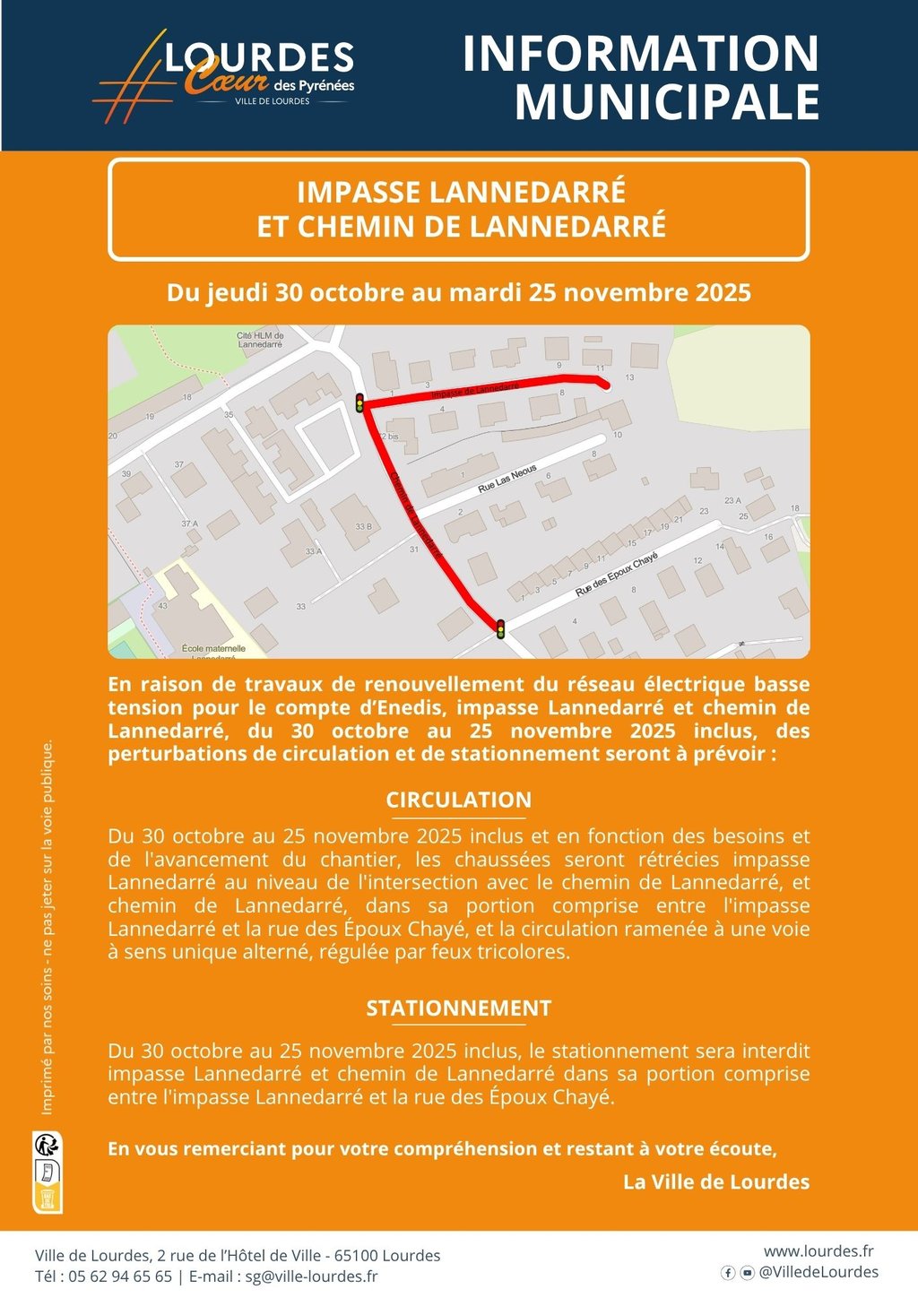 En raison de travaux de renouvellement du réseau électrique basse tension pour le compte d’Enedis, impasse Lannedarré et chemin de Lannedarré, du 30 octobre au 25 novembre 2025 inclus, des perturbations de circulation et de stationnement seront à prévoir :