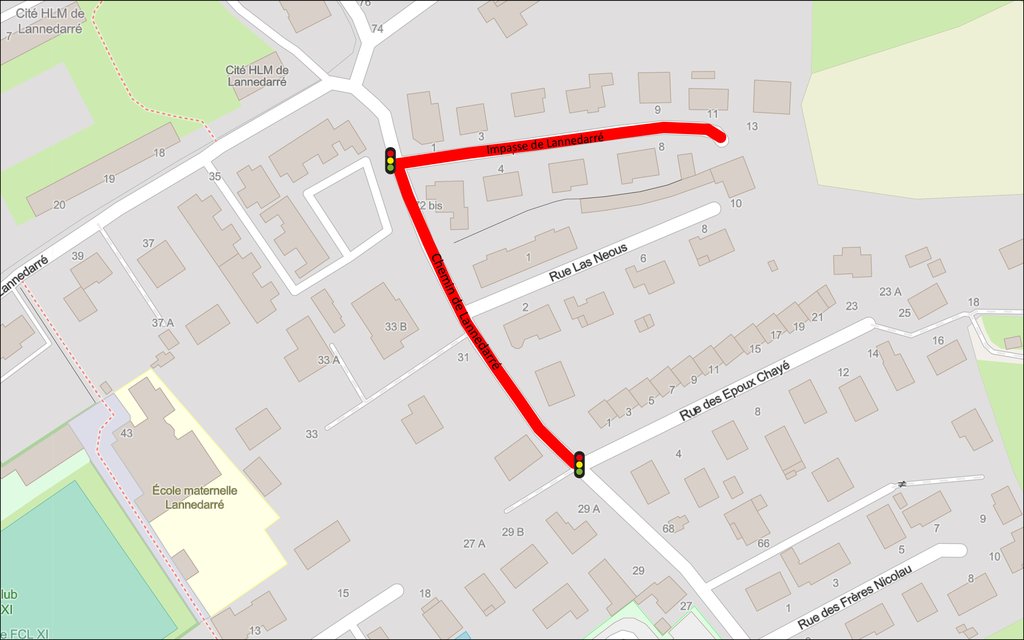 Du 30 octobre au 25 novembre 2025 inclus et en fonction des besoins et de l’avancement du chantier, les chaussées seront rétrécies impasse Lannedarré au niveau de l’intersection avec le chemin de Lannedarré, et chemin de Lannedarré, dans sa portion comprise entre l’impasse Lannedarré et la rue des Époux Chayé, et la circulation ramenée à une voie à sens unique alterné, régulée par feux tricolores.
