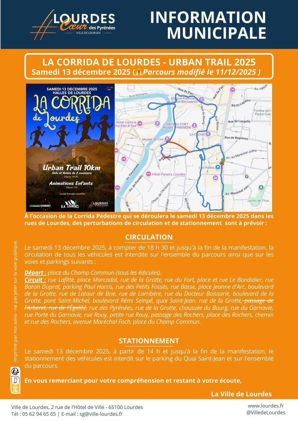 À l’occasion de « La Corrida Pédestre » qui se déroulera le samedi 13 décembre 2025 dans les rues de Lourdes, des perturbations de circulation et de stationnement sont à prévoir :
