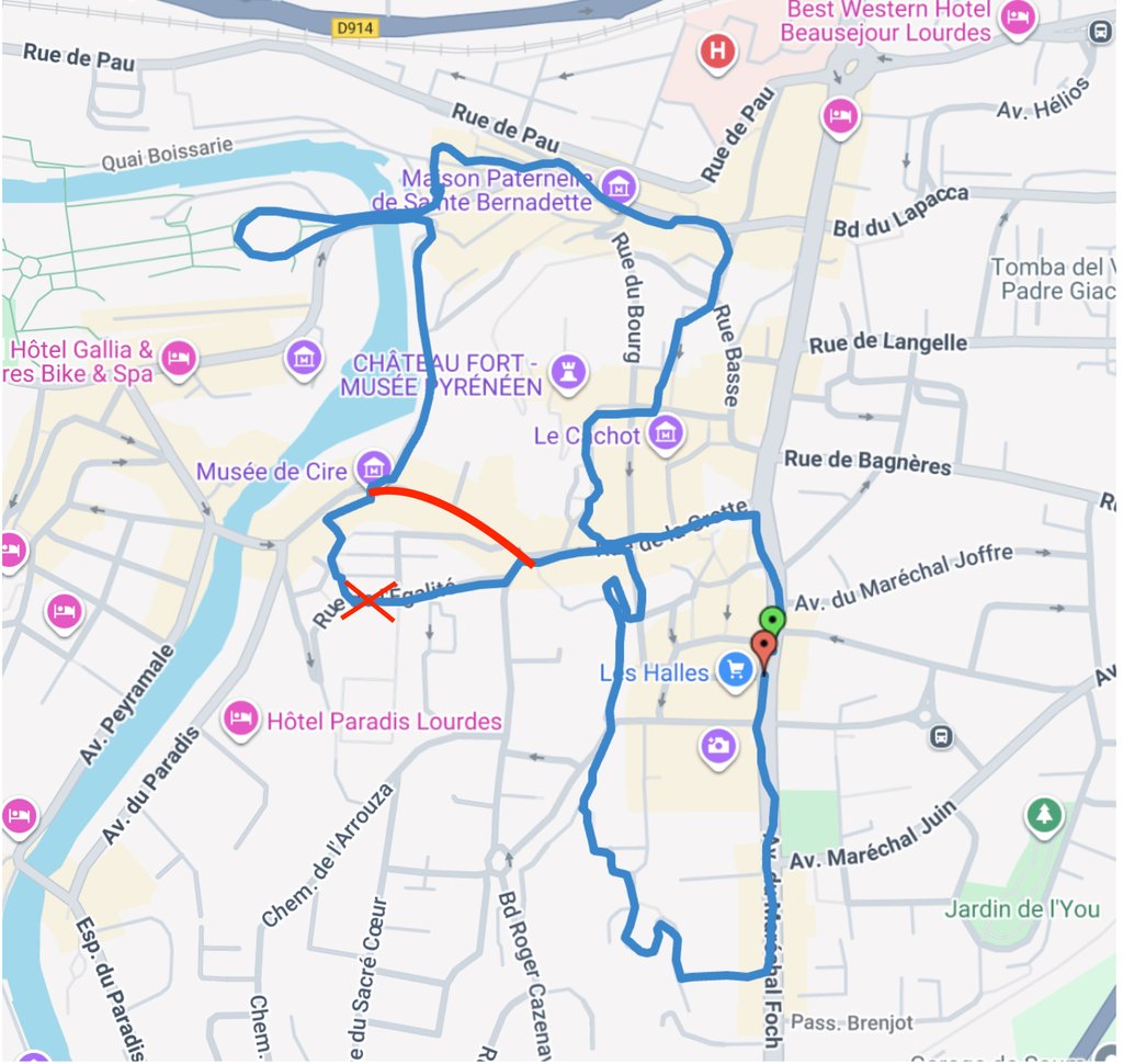 - Circuit : rue Lafitte, place Marcadal, rue de la Grotte, rue du Fort, place et rue Le Bondidier, rue Baron Duprat, parking Paul Harris, rue des Petits Fossés, rue Basse, place Jeanne d’Arc, boulevard de la Grotte, rue de Latour de Brie, rue de Larribère, rue du Docteur Boissarie, boulevard de la Grotte, pont Saint-Michel, boulevard Rémi Sempé, quai Saint-Jean, rue de la Grotte,