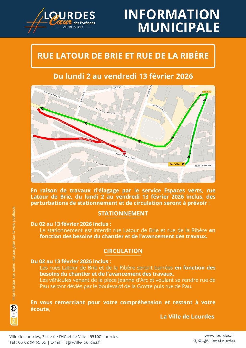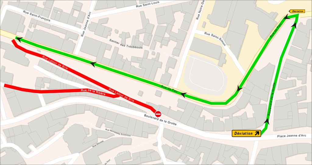 - Les véhicules venant de la place Jeanne d’Arc et voulant se rendre rue de Pau seront déviés par le boulevard de la Grotte puis rue de Pau.