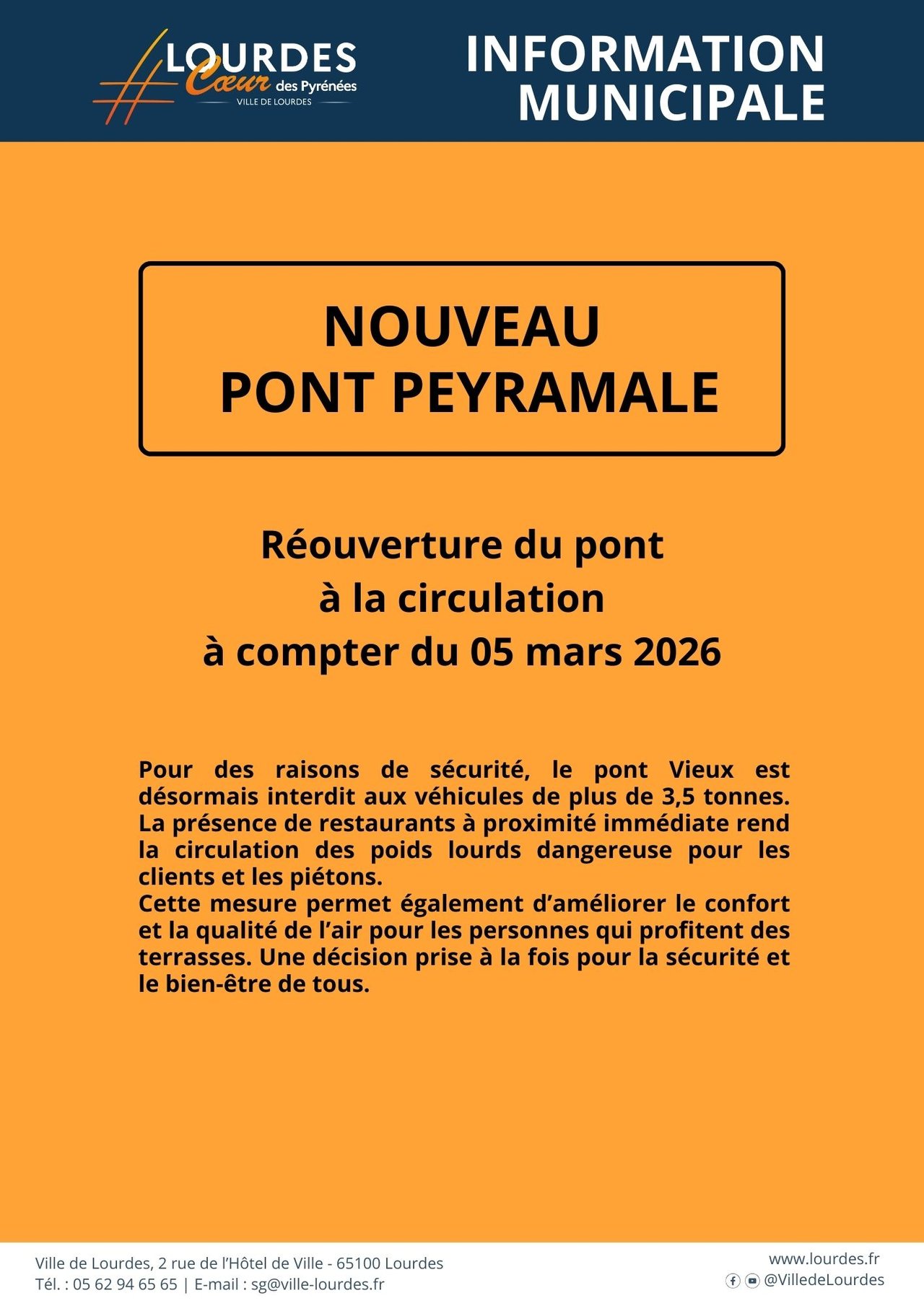 Pour des raisons de sécurité, le pont Vieux est désormais interdit aux véhicules de plus de 3,5 tonnes. La présence de restaurants à proximité immédiate rend la circulation des poids lourds dangereuse pour les clients et les piétons.