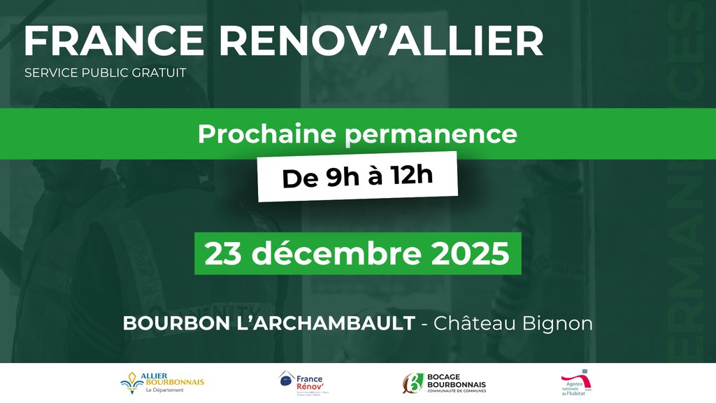Prochaine permanence France Rénov le 23 décembre 2025 à Bourbon-l'Archambault.