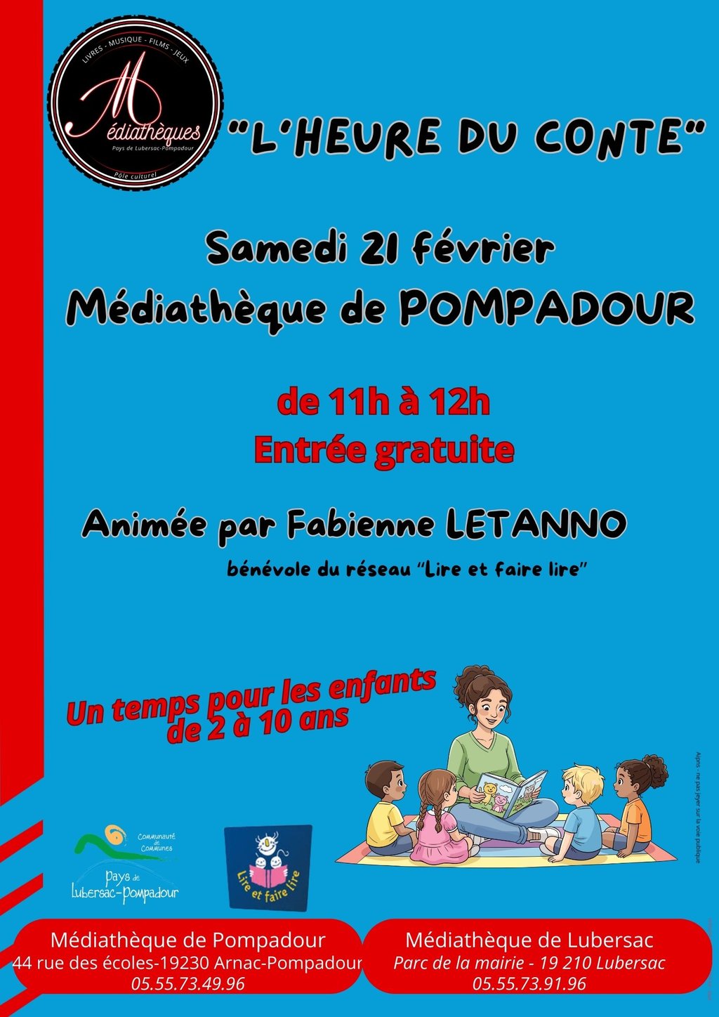 Fabienne LETANNO bénévole du réseau "lire et faire lire" vous donne rendez-vous pour petits et grands pour "l'heure du conte" spécial carnaval samedi 21 février de 11h à 12 h à la médiathèque de Pompadour. (pour les enfants de 2 à 10 ans). Entrée gratuite