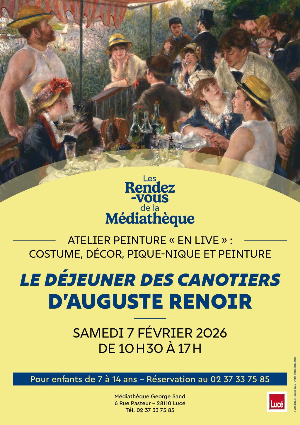 La Médiathèque de Lucé vous invite à vivre une expérience artistique autour du Déjeuner des canotiers d’Auguste Renoir : une journée mêlant peinture, costumes, décor et pique-nique.