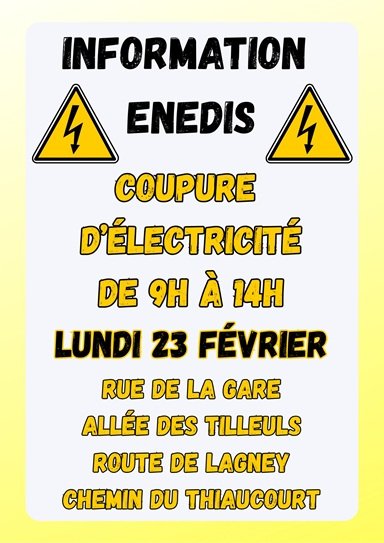 ENEDIS va procéder à une coupure d’électricité lundi 23 février entre 9h et 14h rue de la Gare, allée des Tilleuls, route de Lagney et Chemin du Thiaucourt.