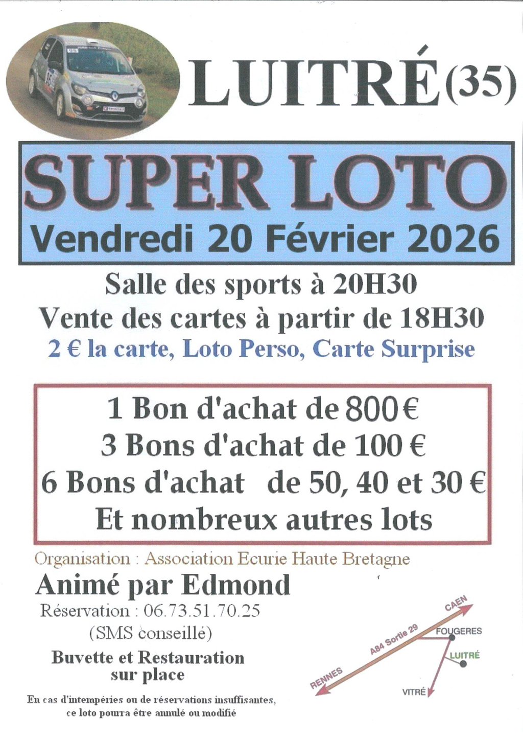 Salle de sports de Luitré à 20h30. Vente des cartes à partir de 18h30. 2€ la carte-Loto Perso-Carte surprise