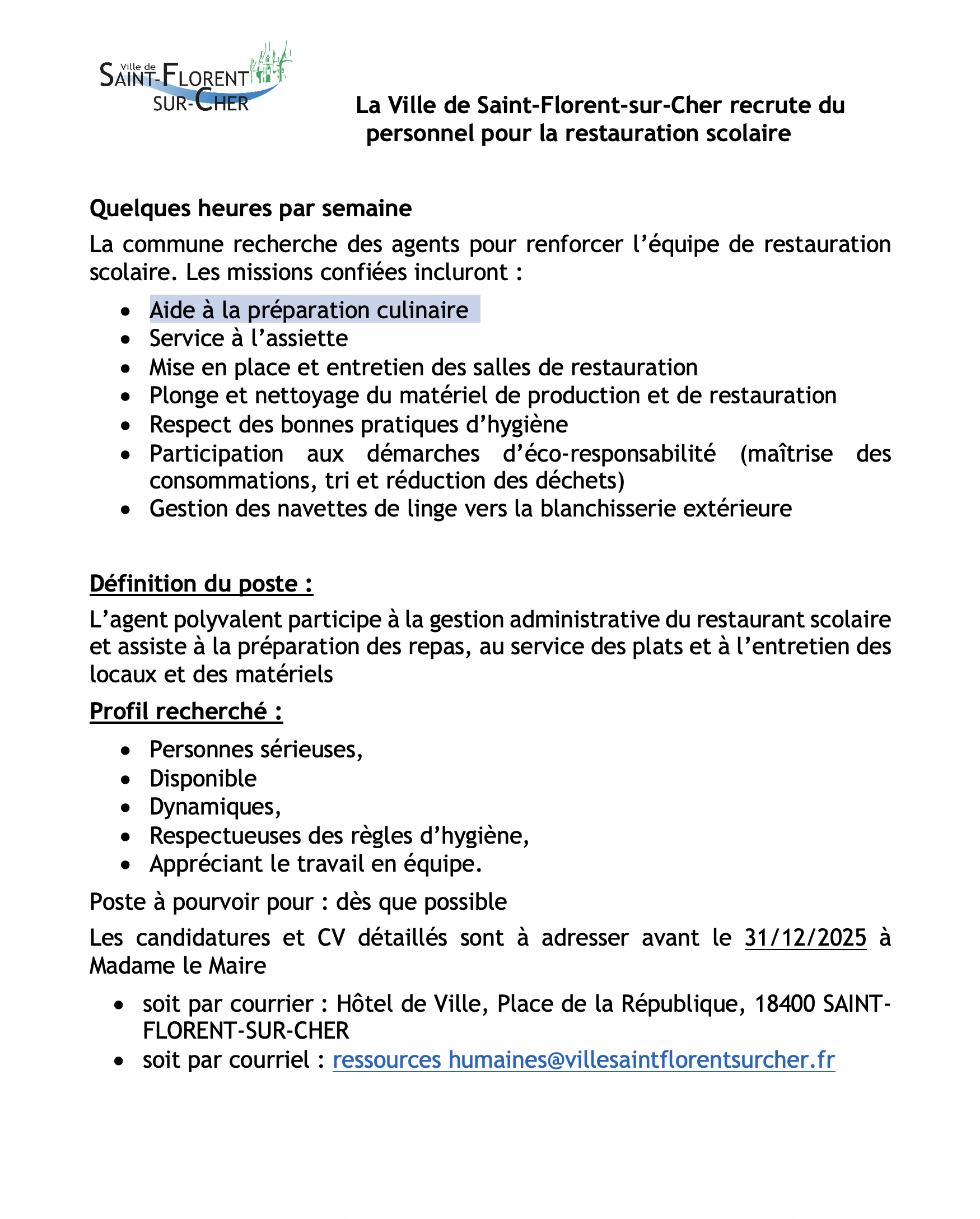 LA VILLE DE SAINT-FLORENT-SUR-CHER RECRUTE DU PERSONNEL POUR LA RESTAURATION SCOLAIRE