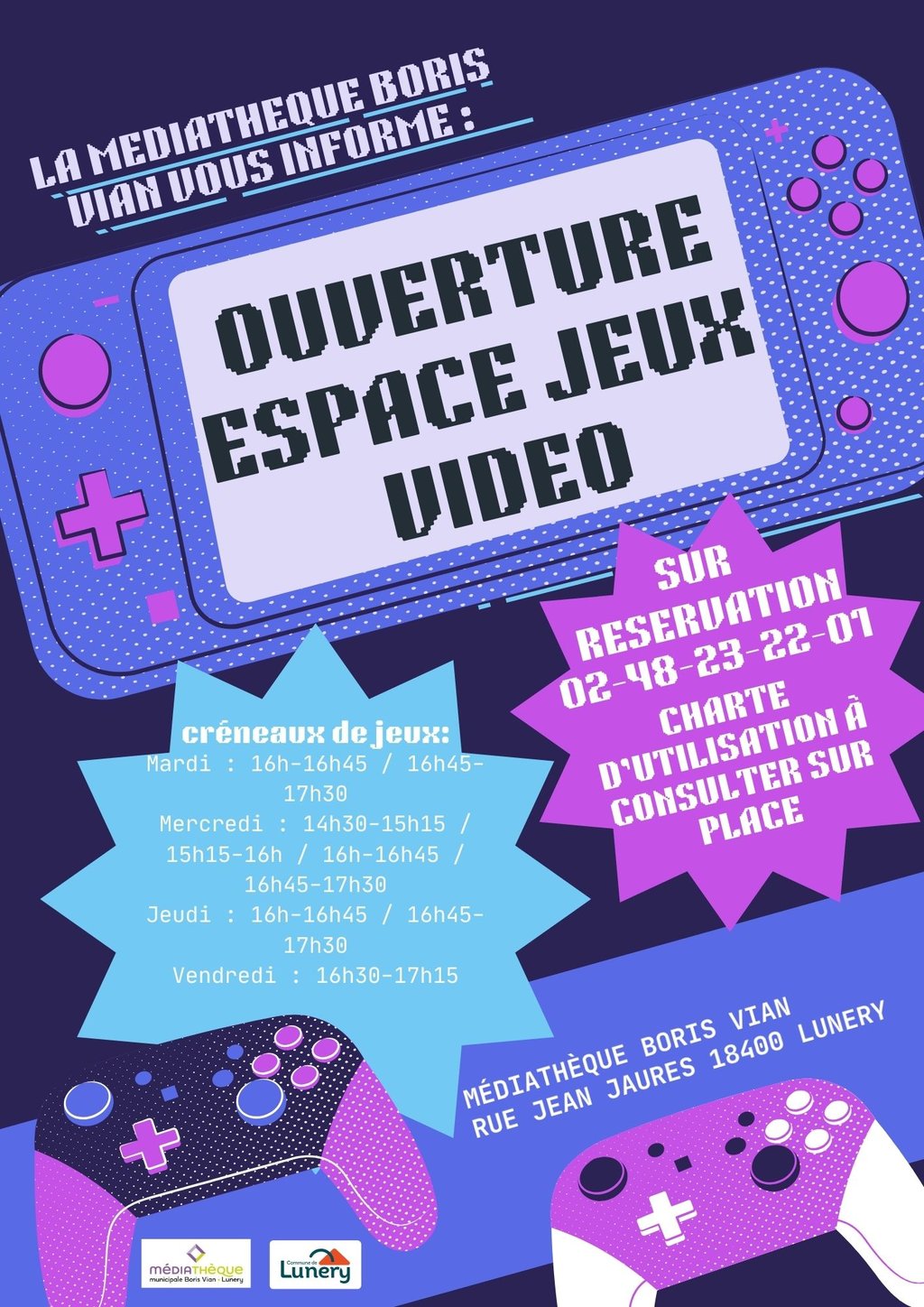 L'Espace Jeux Vidéo de la Médiathèque Boris Vian de Lunery est ouvert suivant les créneaux suivants :