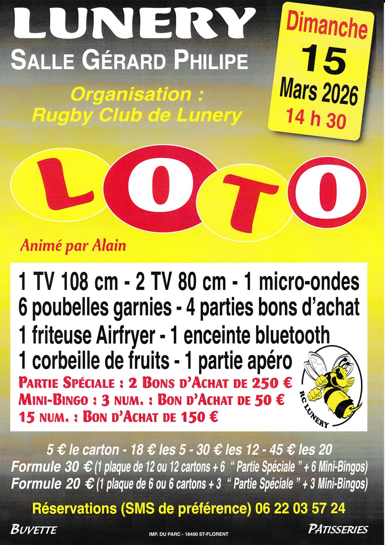 Grand Loto organisé par le RCLunery Rugby et animé par Alain . Début des jeux à 14 h 30 , ouverture des portes à 13 h 30. Réservation auprès d'Alain au 06 22 03 57 24 (SMS de préférence)