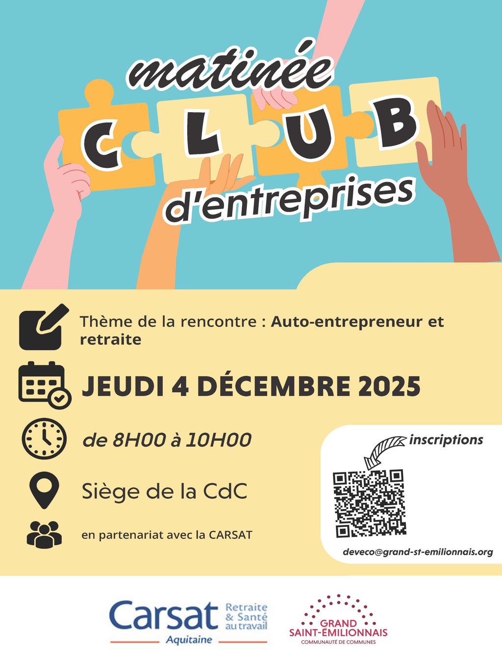 Le 𝐉𝐞𝐮𝐝𝐢 𝟒 𝐃𝐞́𝐜𝐞𝐦𝐛𝐫𝐞 𝐚̀ 𝟖𝐡𝟎𝟎 se réunit le Club d'entreprises du Grand Saint-Emilionnais au siège de la Communauté de Communes, à Saint-Emilion (1109 Route de la Gare).