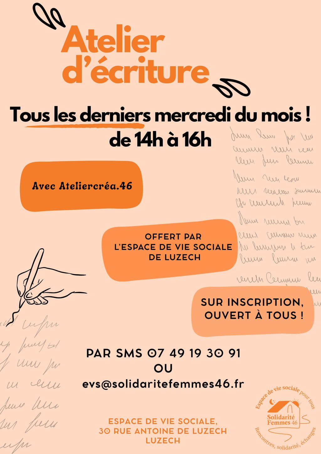 Atelier d'écriture ludique, ouvert à tous, gratuit, place limité ! Mené par Consuelo (ateliercréa.46).