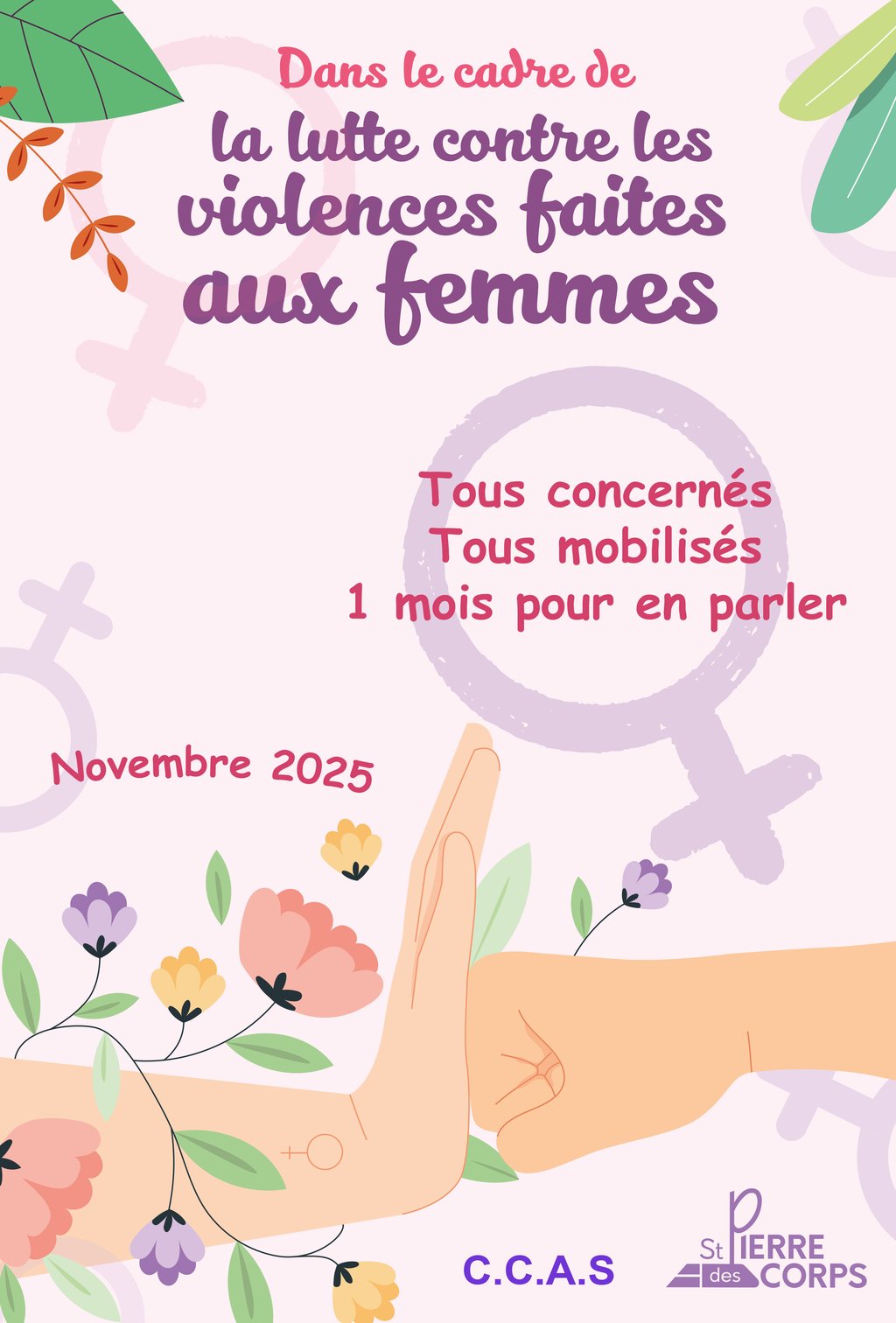 Dans le cadre de sa compétence générale d'action sociale, le CCAS peut être amené à se saisir de thématiques telle que la lutte contre les violences faites aux femmes pour ce mois de novembre 2025. à cette occasion, le CCAS se mobilise pour proposer des animations (gratuites) : ateliers d'expression orale et corporelle, ciné-débat, expositions. Pour plus de renseignements et inscriptions, contactez le CCAS.