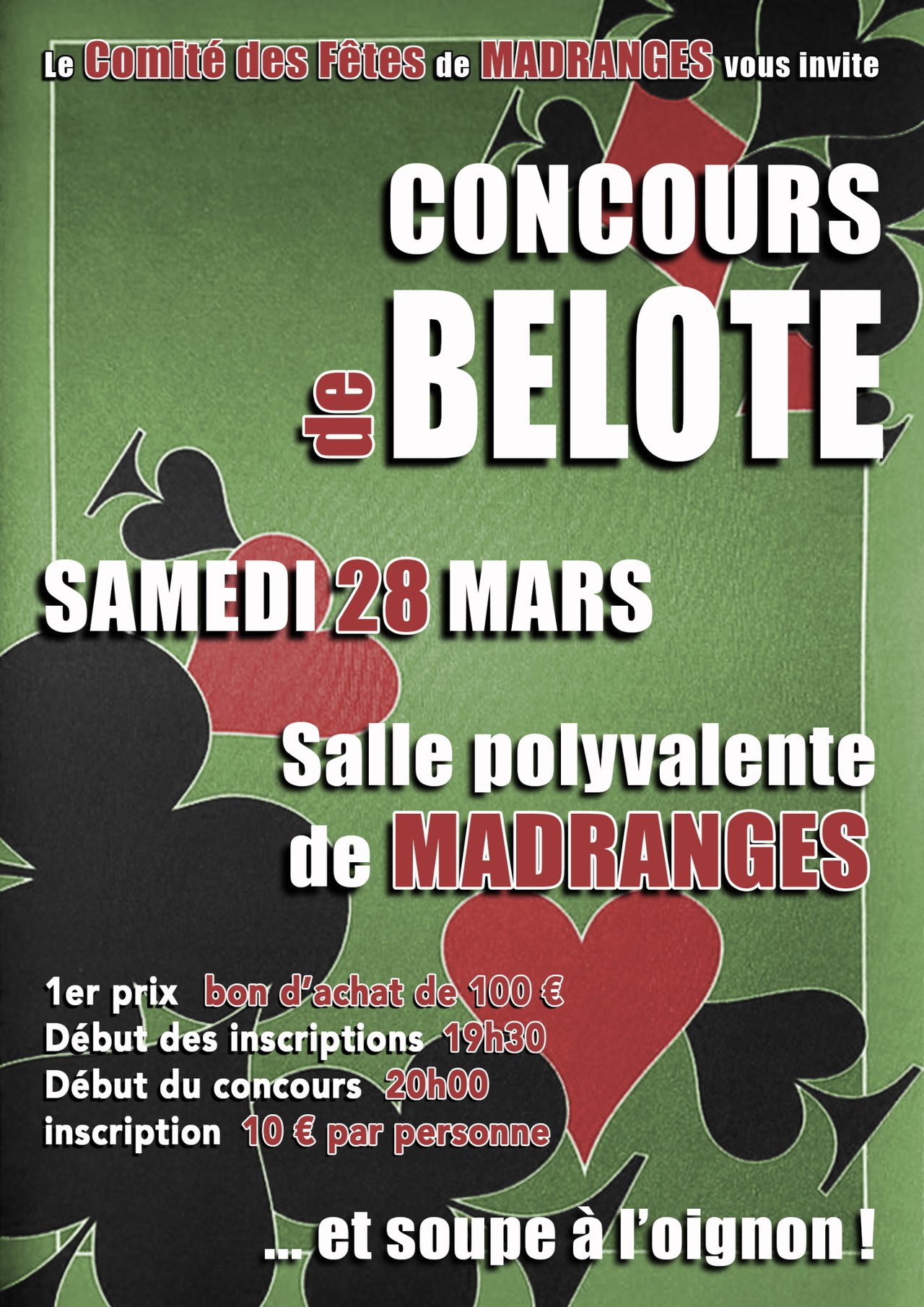 Le comité des fêtes de Madranges vous invite à un concours de Belote le samedi 28 mars 2026 à la salle polyvalente de Madranges.