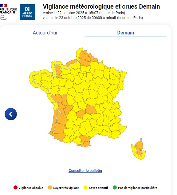 En fin de nuit de mercredi à jeudi, le vent d'ouest déjà soutenu se renforce encore, en particulier sur la côte atlantique et les côtes de Manche : des rafales de 100 à 120 km/h voire localement 130 km/h sont prévues sur le littoral, et de 90 à 110 km/h dans l'intérieur des terres sont attendues d'ici demain après-midi sur les départements en orange.