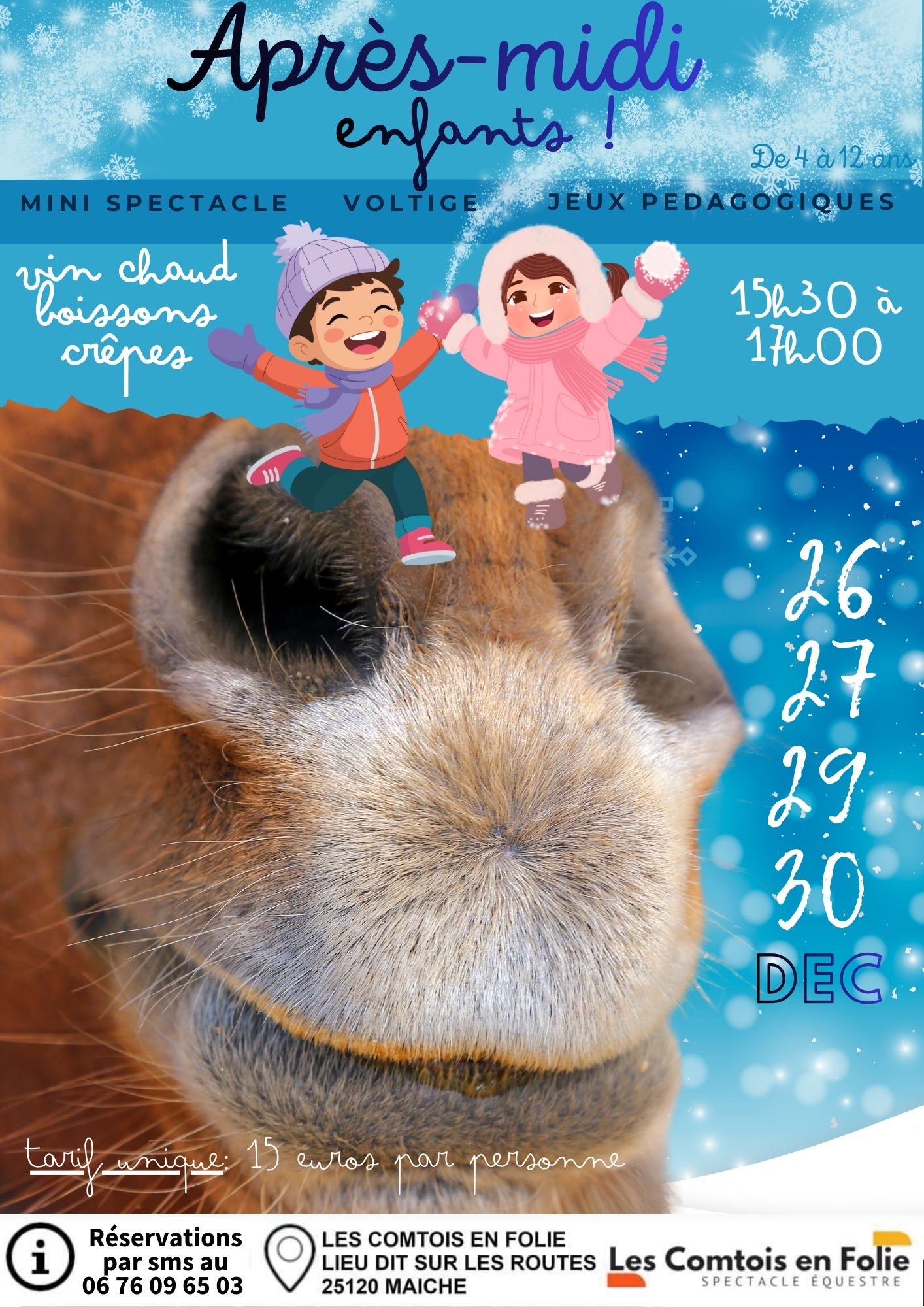 Pendant les vacances la ferme des comtois vous ouvre ses portes et propose des après-midi de jeux pédagogiques, un mini spectacle avec les chevaux comtois et numéros de voltige... Sans oublier les crêpes, les boissons et vin chaud pour les parents ! Réservation obligatoire.