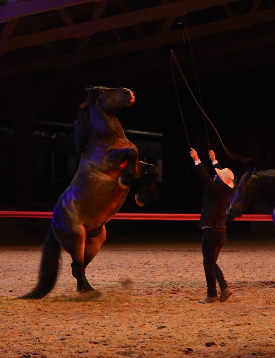 Spectacle équestre avec chevaux et artistes s'unissant pour offrir au public un show éblouissant riche en surprises.