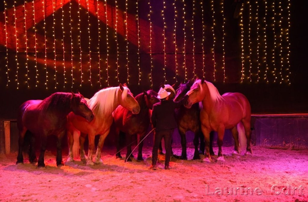 Spectacle équestre avec chevaux et artistes s'unissant pour offrir au public un show éblouissant riche en surprises.