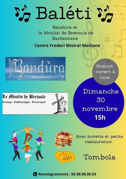Vibrez au rythme des danses traditionnelles provençales avec le groupe Bandùra de Maillane et le Moulin de Bretoule de Barbentane. Apprenez les pas dans une ambiance conviviale et festive. Pour tous les niveaux. Danses et animations musicales. Restauration et buvette sur place. Tombola avec de nombreux lots à gagner. Un moment idéal pour partager la culture provençale, danser s'amuser et passer une belle après midi en famille ou entre amis !