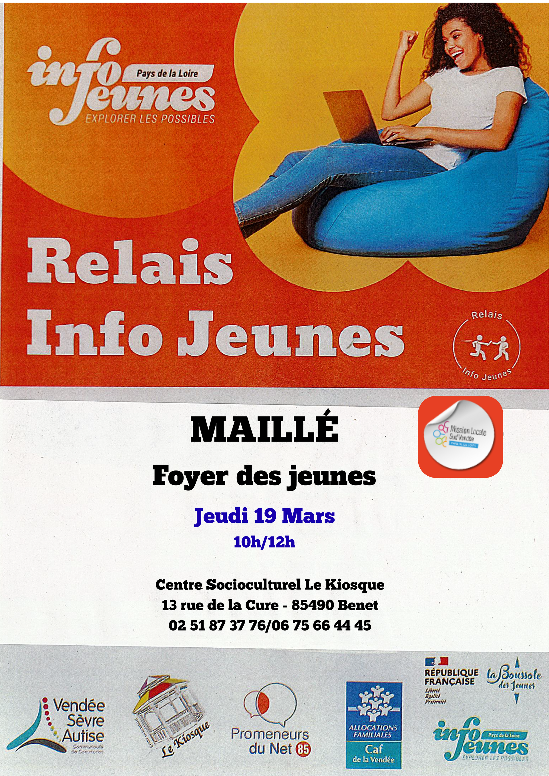 Le Relais Info Jeunes sera sur Maillé, au foyer des jeunes, le jeudi 19 mars 2026 de 10 h 00 à 12 h 00.