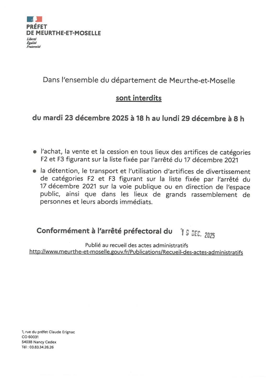 Conformément à l'arrêté préfectoral du 19 décembre 2025