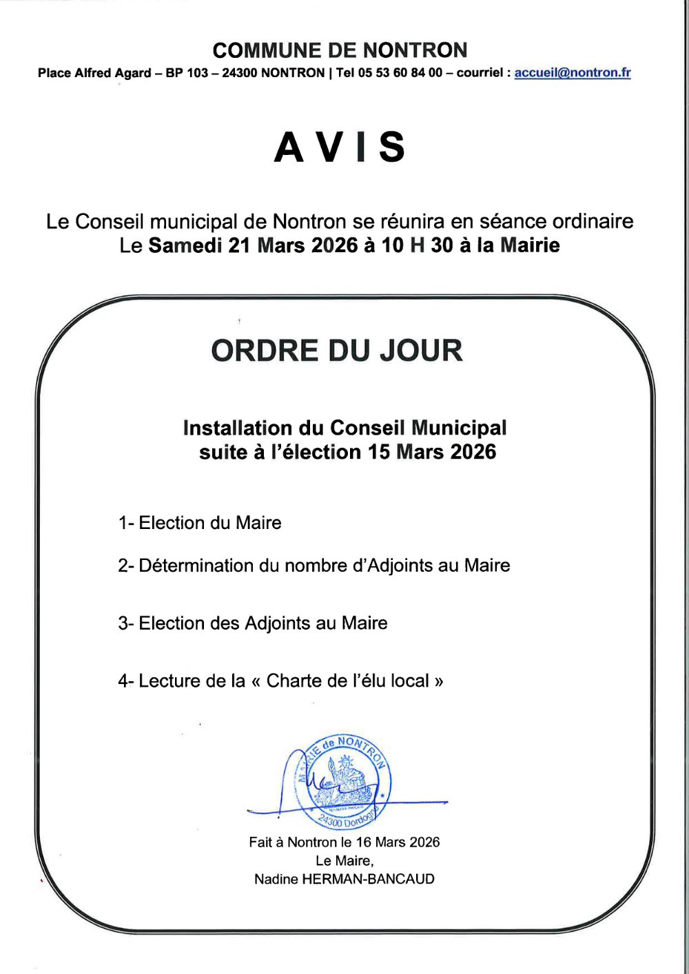Conseil Municipal, samedi 21 mars 2026 à 10h30, salle du Conseil.