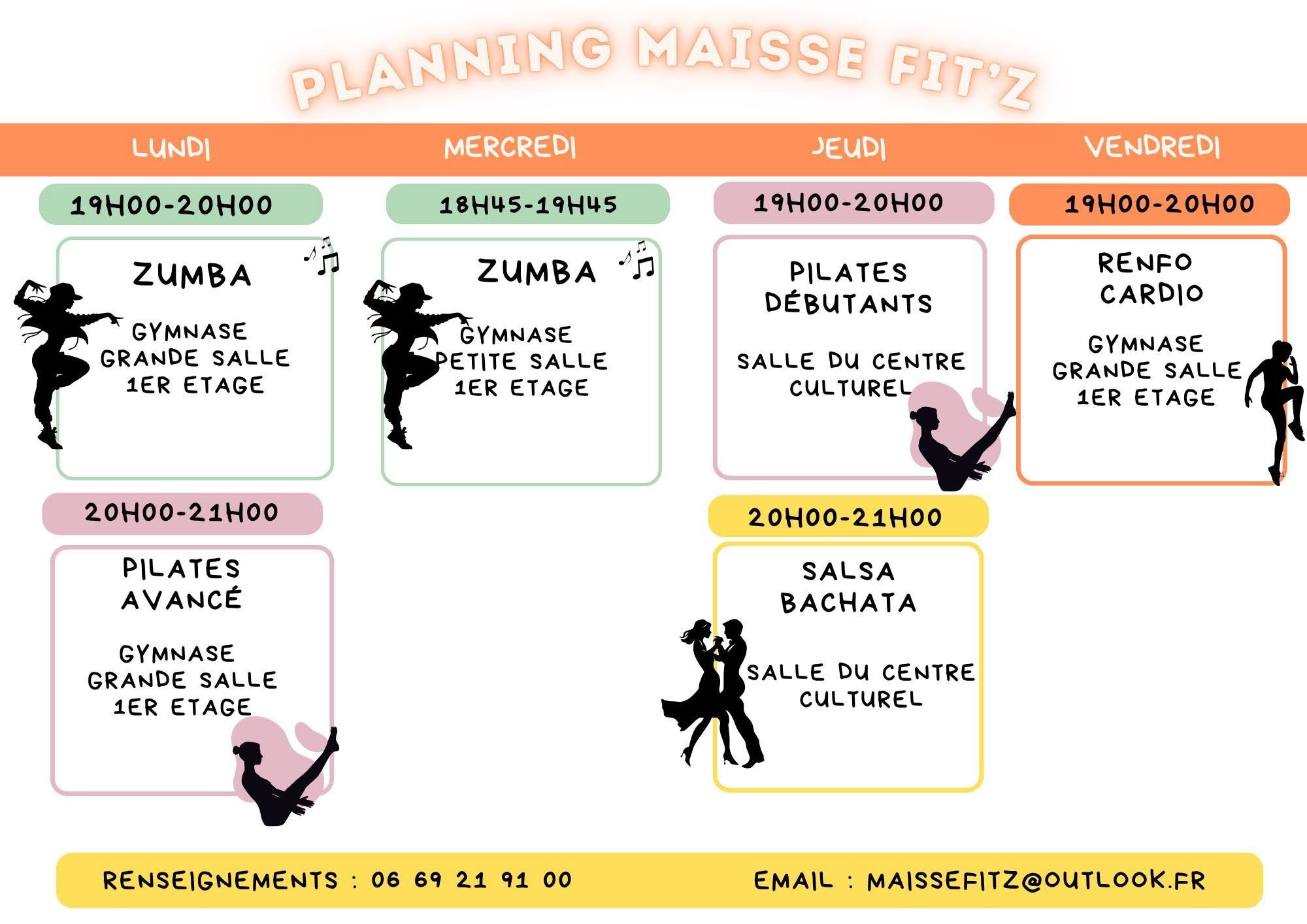 Maisse Fit'z vous accueille dans une ambiance conviviale et chaleureuse ouvert à tous à partir de 15 ans, pour vous proposer des activités sportives de qualité et tous niveaux. La Zumba vous permettra de vous tonifier, de brûler de l'énergie en vous vidant la tête par son programme physique d'enchaînements chorégraphiés et souvent renouvelés par notre professeur Jade, dont la gaieté et le dynamisme sont communicatifs. La Zumba Strong est un cours plus intense et puissant d'enchaînements fractionnés. Le Pilates, est plus méthodique, il renforce les muscles profonds responsables de la posture, ainsi il relaxe en évacuant le stress.