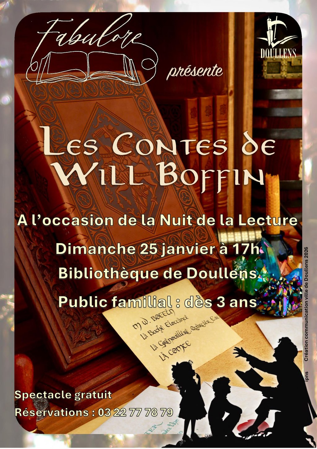 Dans le cadre de la nuit de la lecture, la bibliothèque de Doullens vous propose "Les contes de Will Boffin" le dimanche 25 janvier à 17h
