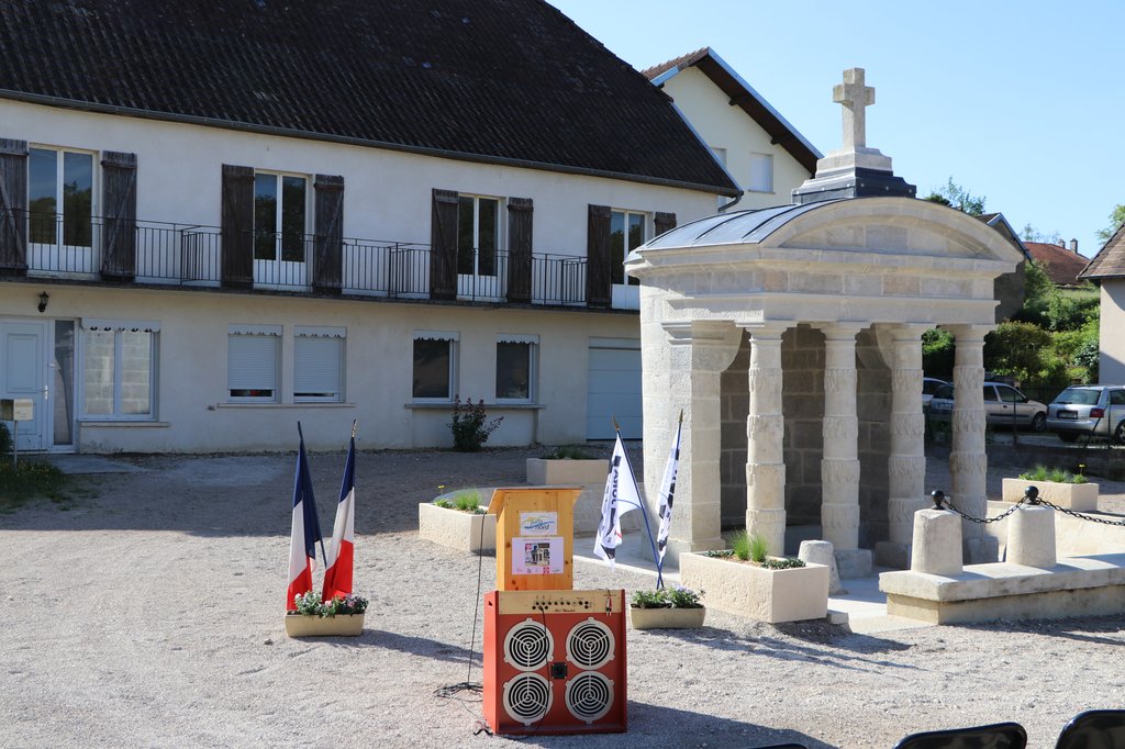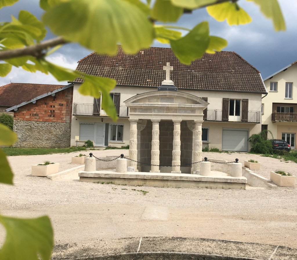 Elément principal d’un programme qui comprenait aussi un lavoir, un abreuvoir et un puisard, cette œuvre originale du XVIIIe siècle constitue l’ornement principal de la belle place arborée du village. Doté de puissantes colonnes à décor « en glaçons » et surmonté d’une croix, le monument, classé en 1970, est attribué à l’architecte Antoine-Louis Attiret, auteur de la fontaine d’Arrans à Dole. La fontaine, dont les fondations sont devenues instables, nécessite une intervention en sous-œuvre par introduction de micro pieux. Dans les élévations, qui devront être nettoyées et rejointoyées, de nombreuses pierres, gelées, doivent être remplacées, Il faut aussi assurer l’étanchéité de la couverture en dalles de pierre, qui connaît d’inquiétants désordres.