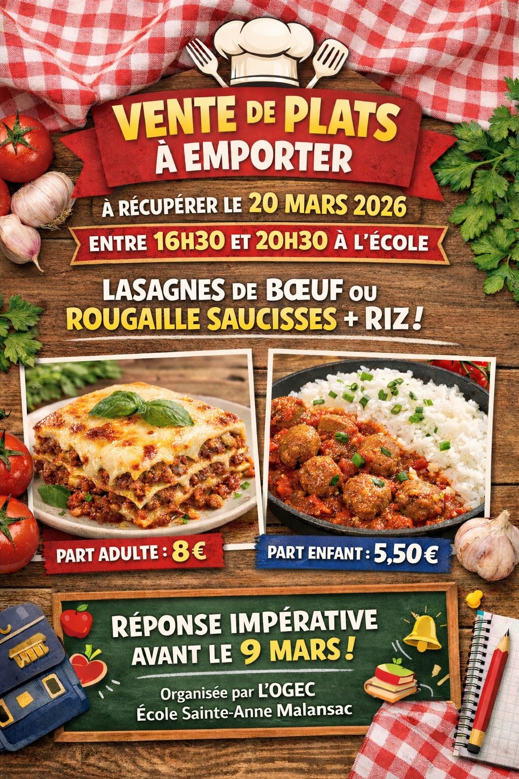 L’OGEC organise une vente de plats à emporter
