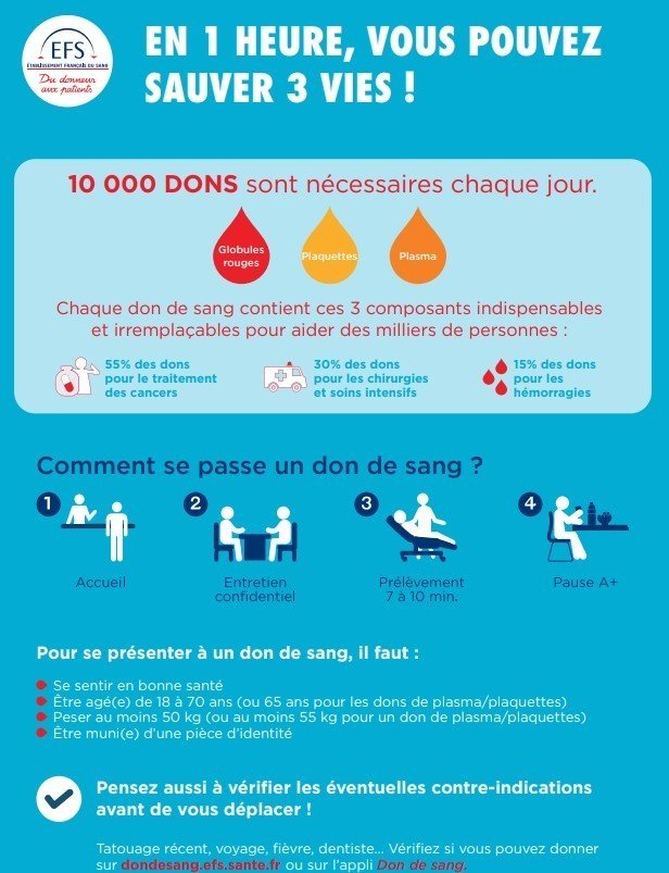 "Un acte généreux et solidaire ! Peu importe ses motivations, peu importe son groupe sanguin : donner son sang et son plasma, c’est sauver des vies quotidiennement. La mobilisation doit se poursuivre pour continuer à répondre aux besoins des patients et des malades ! Les dons de sang, de plasma sont incontournables pour soigner des personnes atteintes de leucémies, de cancers, accidentées de la route, ou encore qui vivent un accouchement difficile, etc. "