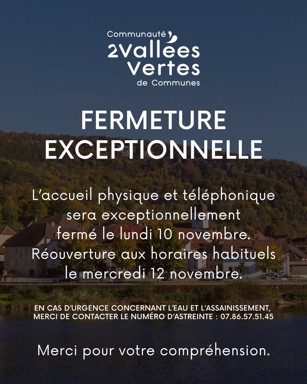 L’accueil physique et téléphonique de la Communauté de Communes des 2 Vallées Vertes sera exceptionnellement fermé le lundi 10 novembre.