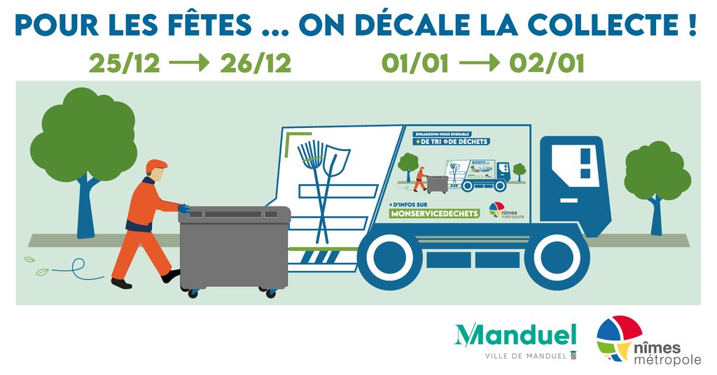 A l'occasion des fêtes de fin d'année, Nîmes métropole vous informe que les collectes initialement prévues les jeudis 25 décembre 2025 et 1er janvier 2026 se dérouleront respectivement les vendredis 26 décembre 2025 et 2 janvier 2026.