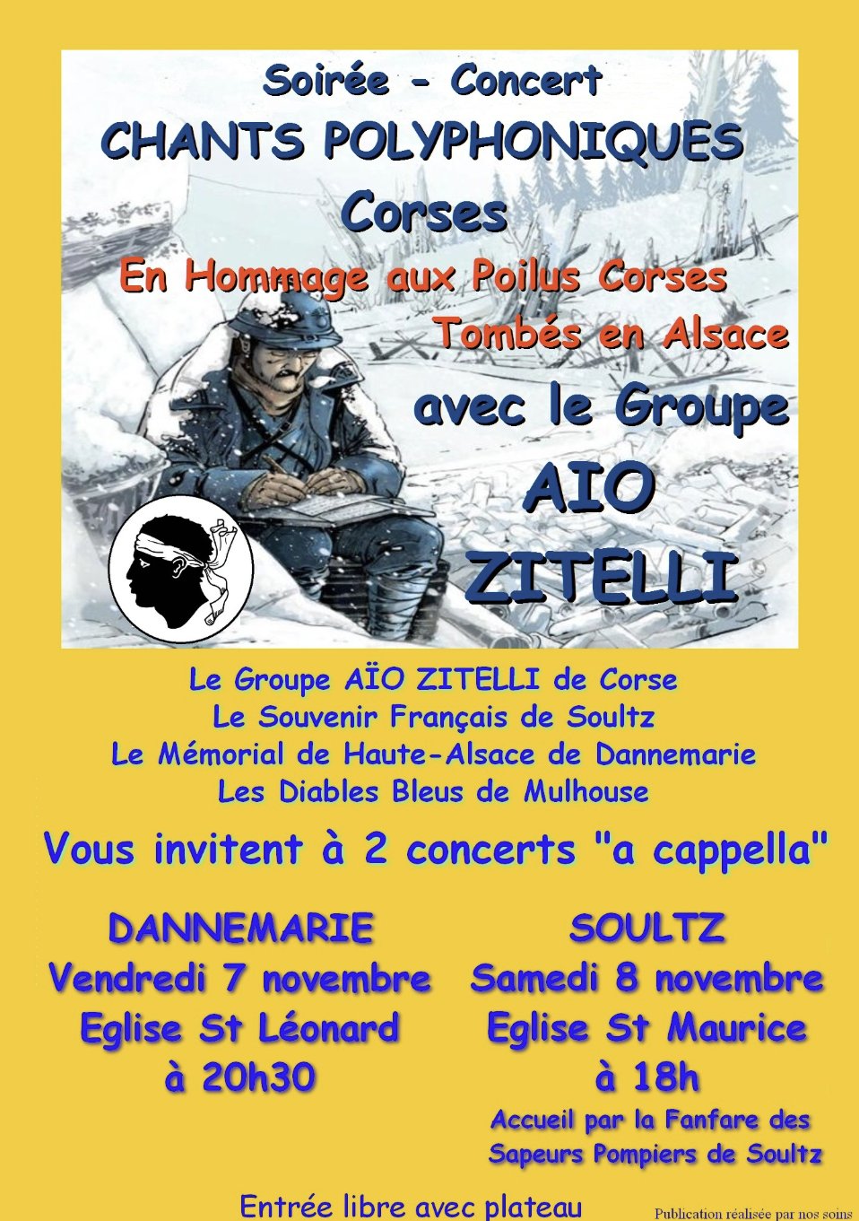 Dans le cadre des commémorations du 11 novembre, Le Mémorial de Haute Alsace de Dannemarie, Les Diables Bleus de Mulhouse et le Souvenir Français de Soultz vous invitent à participer à deux soirées de concert avec l’ensemble polyphonique corse « Aïo Zitelli ». Il se produira en l’église Saint Léonard de Dannemarie le 7 novembre prochain à 20h30 et à Soultz à l’église St Maurice le samedi 8 novembre à 18h00.