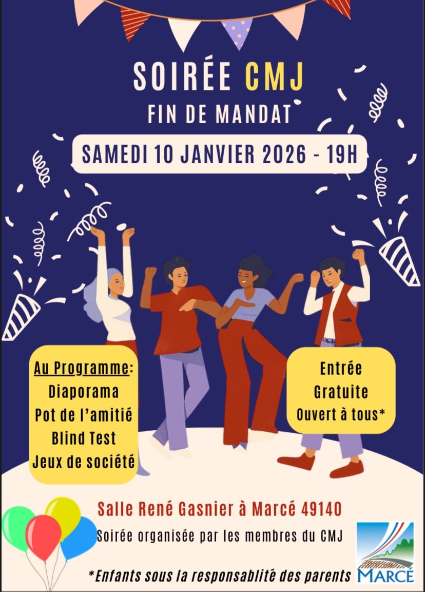 Les élu-e-s du Conseil Municipal des Jeunes vous convient à une soirée pour célébrer ensemble la fin de leur mandat. Ce sera l'occasion de se retrouver autour d'un pot de l'amitié tout en visionnant un diaporama retraçant les actions menées par le CMJ lors de ce mandat. La soirée se poursuivra pour ceux qui le souhaitent autour de différents jeux.