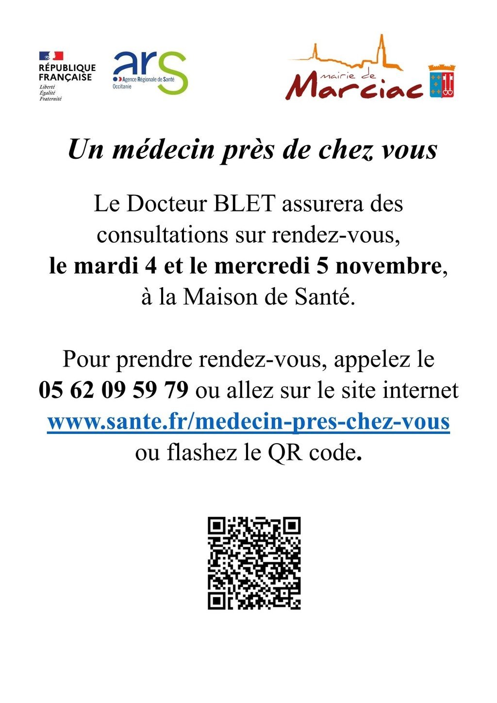 Le Docteur BLET assurera des consultations sur rendez-vous, le mardi 4 et le mercredi 5 novembre, à la Maison de Santé.