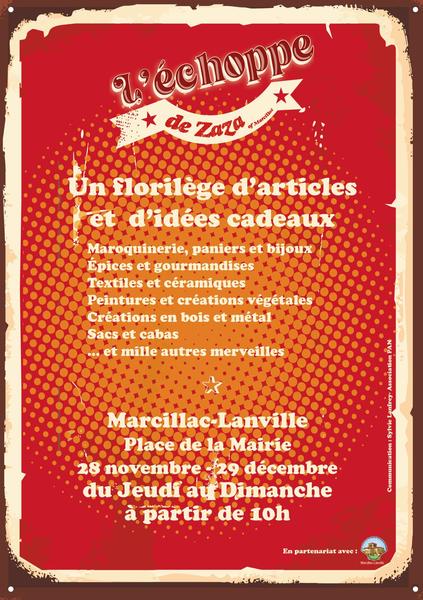 L'échoppe de ZAZA ouvre ses portes à Marcillac-Lanville du 15 novembre au 28 décembre, du jeudi au dimanche de 10h à 13h et de 15h à 19h et plus....Inauguration le samedi 22/11 de 18h30 à 22 h.