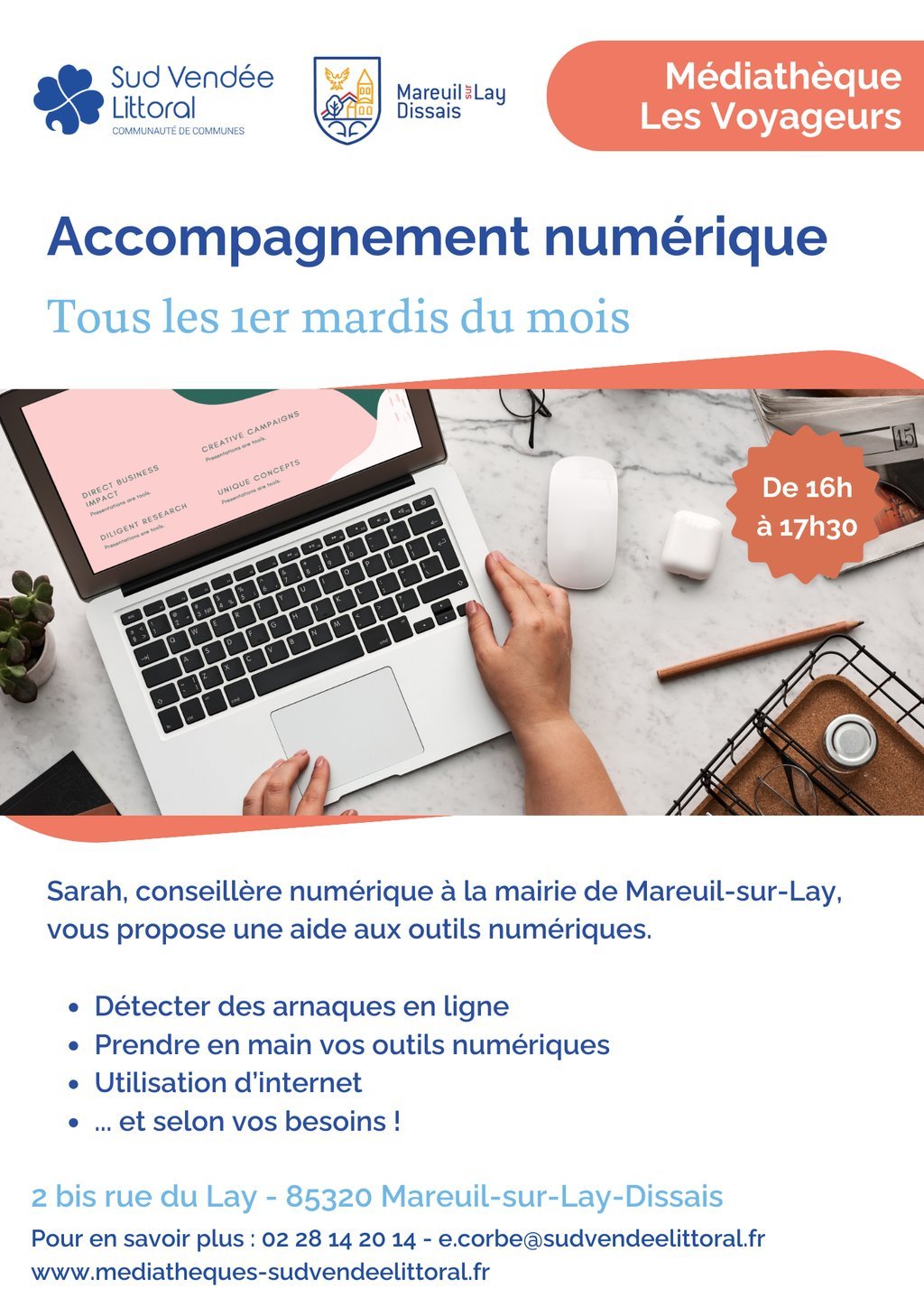 Sarah, conseillère numérique de la mairie de Mareuil-sur-Lay-Dissais sera présente pour vous proposer une assistance concernant la prise en main de vos outils numériques (smartphone, ordinateur, tablette), la gestion de vos mails et de vos photos, l'utilisation d'Internet, repérer des arnaques en ligne et autres besoins.