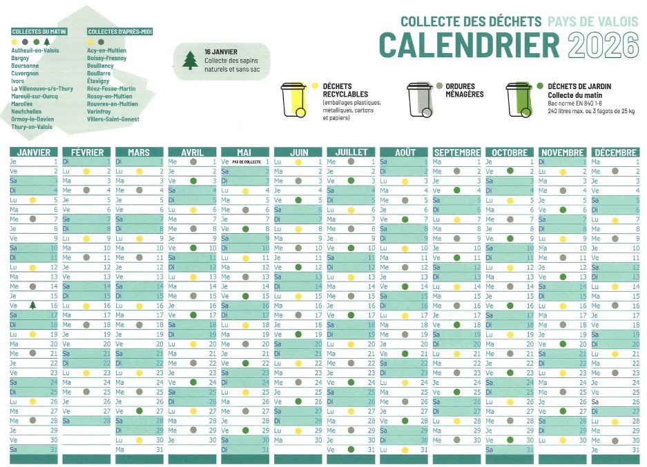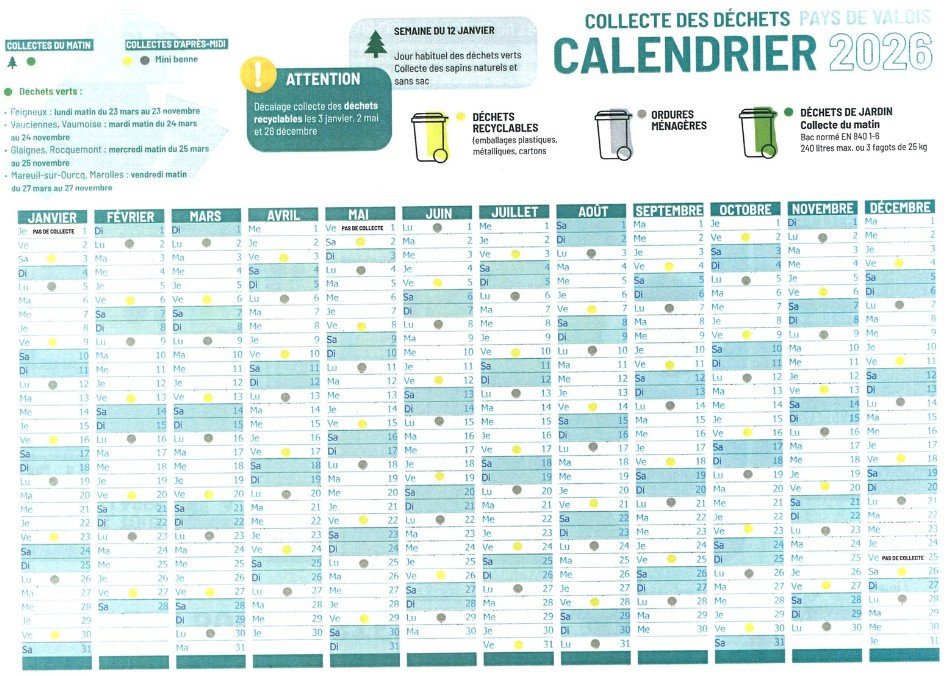 Chers habitants, Le calendrier de collecte des déchets pour l’année 2026 est désormais disponible ! Vous le trouverez sur les photos ci-jointes, comprenant également les dates de passage des mini-bennes. Nous vous invitons à le consulter attentivement afin de connaître les jours de ramassage correspondant à votre secteur.