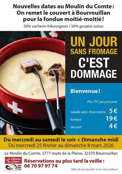 Le Moulin du Comte vous propose des repas "fondue suisse" du mercredi au samedis le soir et dimanche midi (19€ la fondue seule - 5€ entrée salade et charcuterie - dès 4€ le dessert du jour). Réservations au plus tard la veille