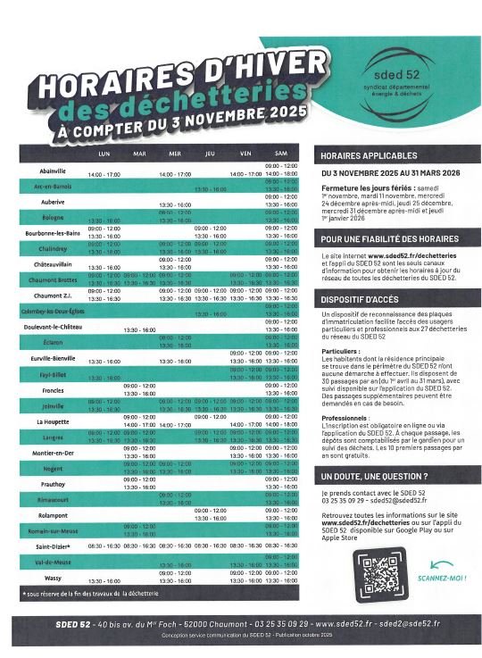 Voici les nouveaux horaires d'hiver des déchetteries applicables du 3 novembre 2025 au 31 mars 2026.