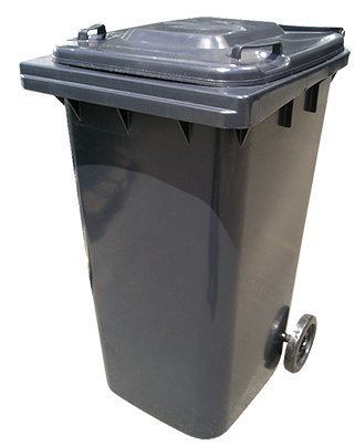 Bac noir avec la poignée côté rue, en bordure de trottoir.