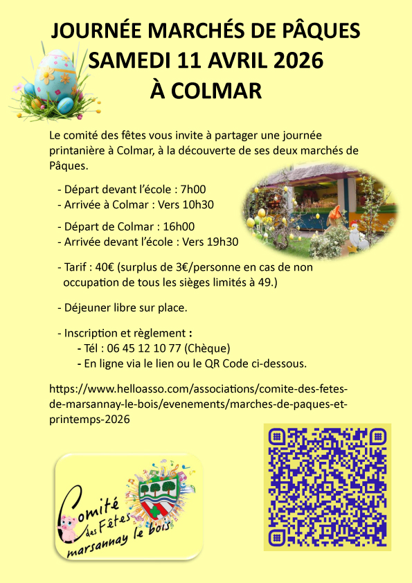 Le comité des fêtes organise un voyage à Colmar le 11 Avril, à l'occasion du marché de printemps.