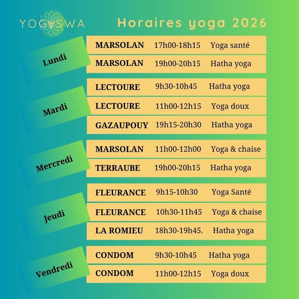Les cours collectifs de yoga reprennent à partir du 19 janvier dans toutes nos salles, c'est l'occasion de venir essayer. Merci d' informer les habitants de la commune pour qu'ils puissent en bénéficier.